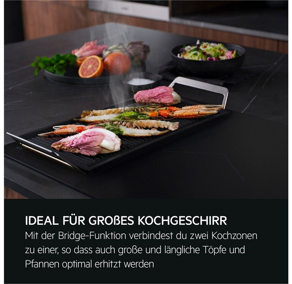 Das AEG TK85IM0FSZ ist das ideale Upgrade für Köche, denen 60 cm Standardbreite nicht ausreichen. Durch die großzügige 80 cm XL-Fläche lassen sich mehrere große Töpfe und Pfannen gleichzeitig nutzen, ohne dass es zu Platzproblemen kommt. Die Bridge-Funktion auf der linken Seite ist perfekt für Grillplatten oder längliche Bräter geeignet, da sie zwei Zonen zu einer homogenen Heizfläche vereint.