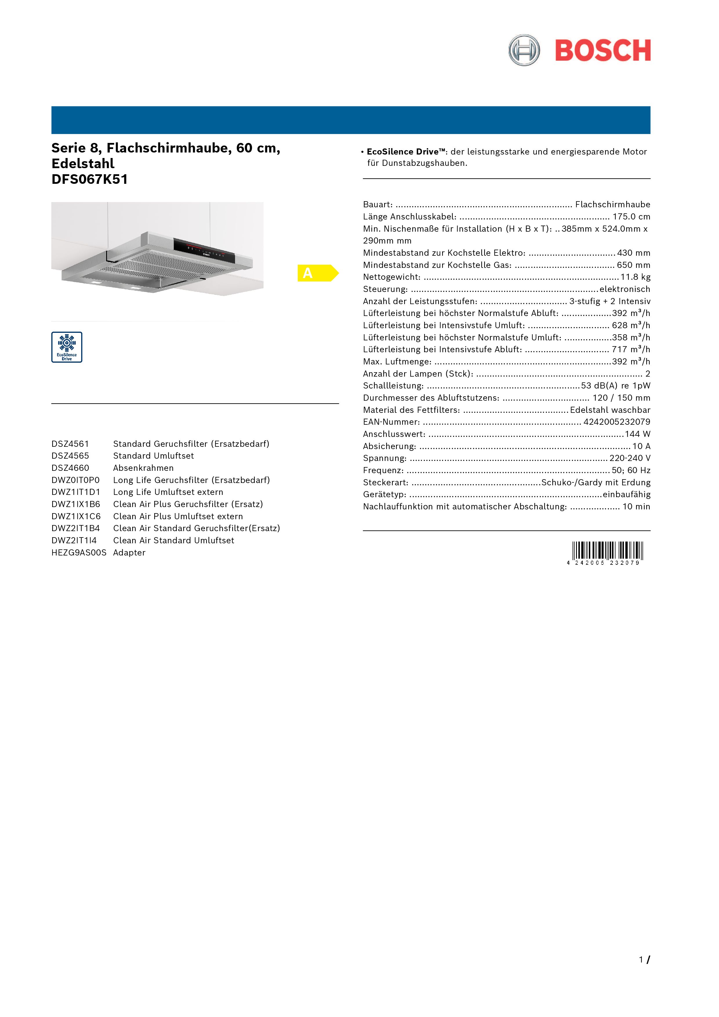 Eigenschaften "Bosch DFS067K51 Flachschirmhaube Drucktasten "