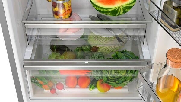 | Innenraum-Ausstattung | 0-Grad-Zone, transparente Gefriergutschublade, Abstellflächen, Türregale, Flaschenablage, Obst- und Gemüseschalen, Eierablage, Gefriergutschubladen, Innenraumbeleuchtung |