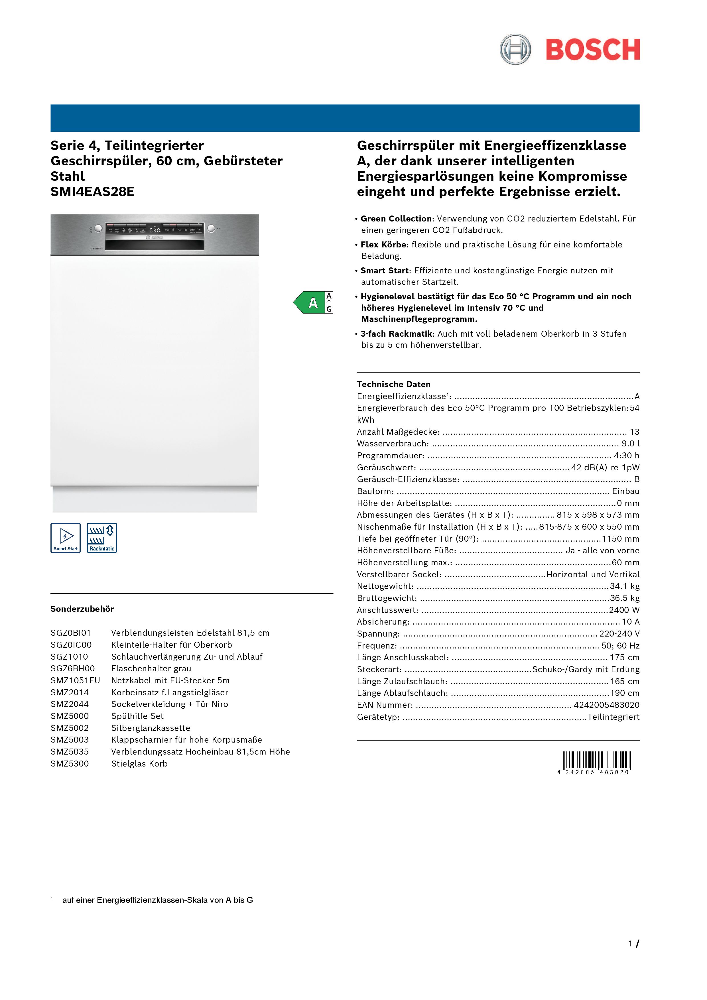 Eigenschaften "Bosch SMI4EAS28E Serie 4, Smarter Geschirrspüler Teilintegriert 60 cm"