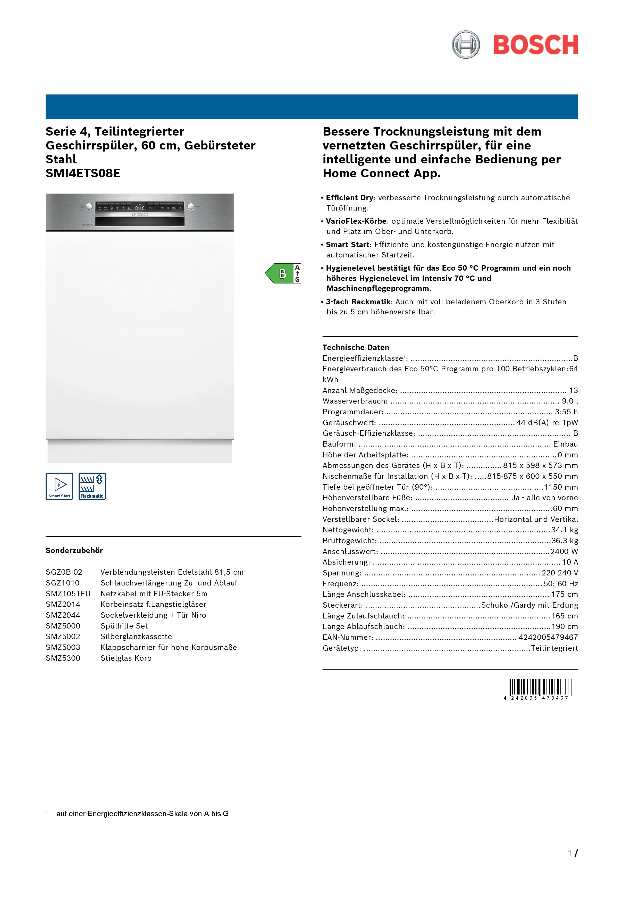 Eigenschaften "Bosch SMI4ETS08E Serie 4, Smarter Geschirrspüler Teilintegriert 60 cm, Besteckkorb"