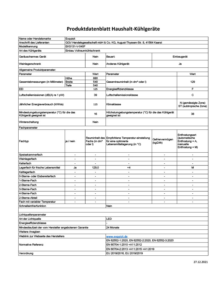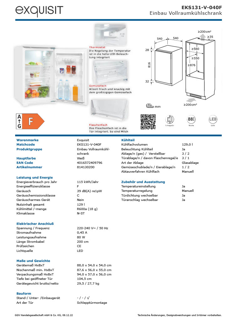 Eigenschaften "Exquisit EKS131-V-040F – Integrierbarer Einbaukühlschrank mit 129 Litern und LED-Beleuchtung"