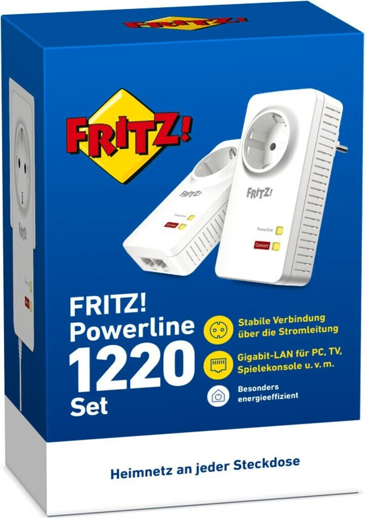 | Lieferumfang | 2× FRITZ!Powerline 1220, 2× Netzwerkkabel, Installationsanleitung |