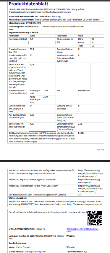 233 kWh/Jahr, 9 kg, 65 dB, 800 Watt, Wärmepumpe, Trommelinnenbeleuchtung, höhenverstellbare Füße, Kondensatbehälter, Flusenfilter