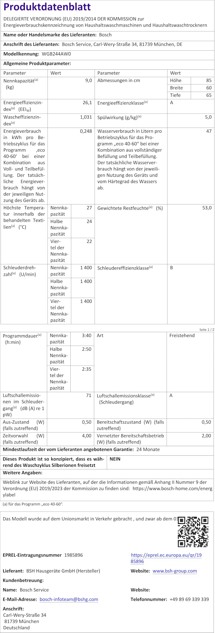47 kWh / 100 Zyklen, 8 kg, 1.400 U/Min, Startzeitvorwahl, Reinigungsprogramm, verstellbare Gerätefüße