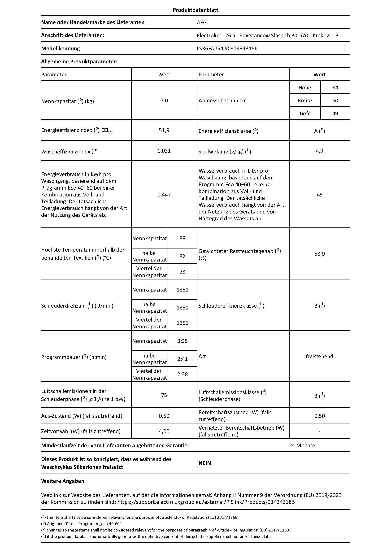 45 kWh / 100 Zyklen, 7 kg, 75 dB(A), 1.400 U/Min, Startzeitvorwahl, Knitterschutz
