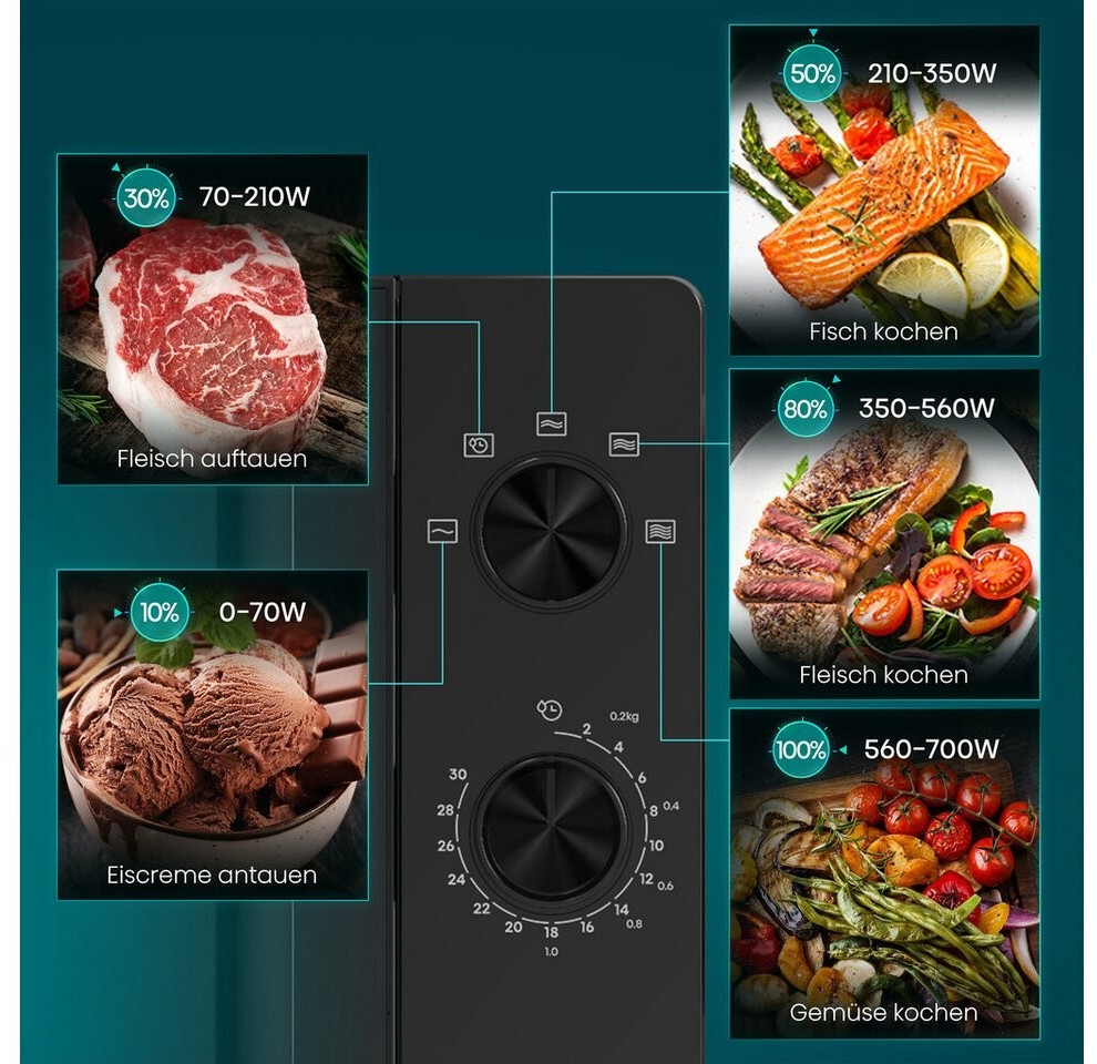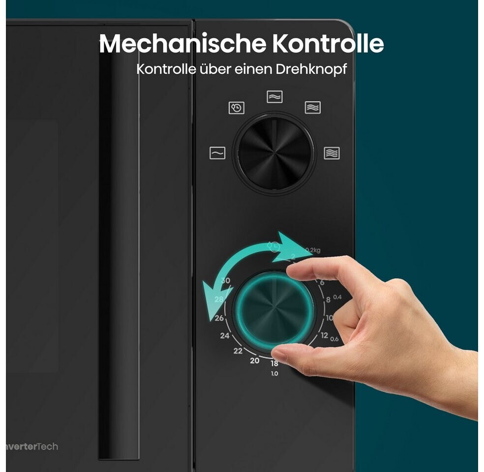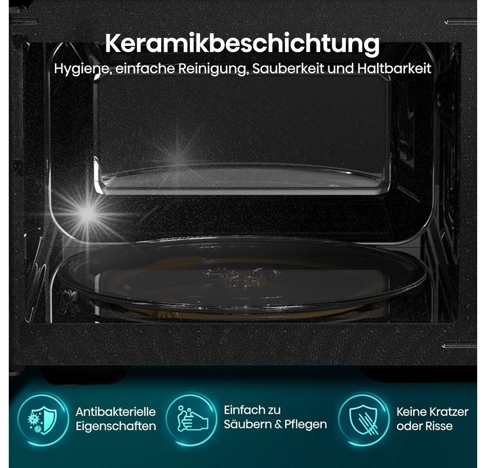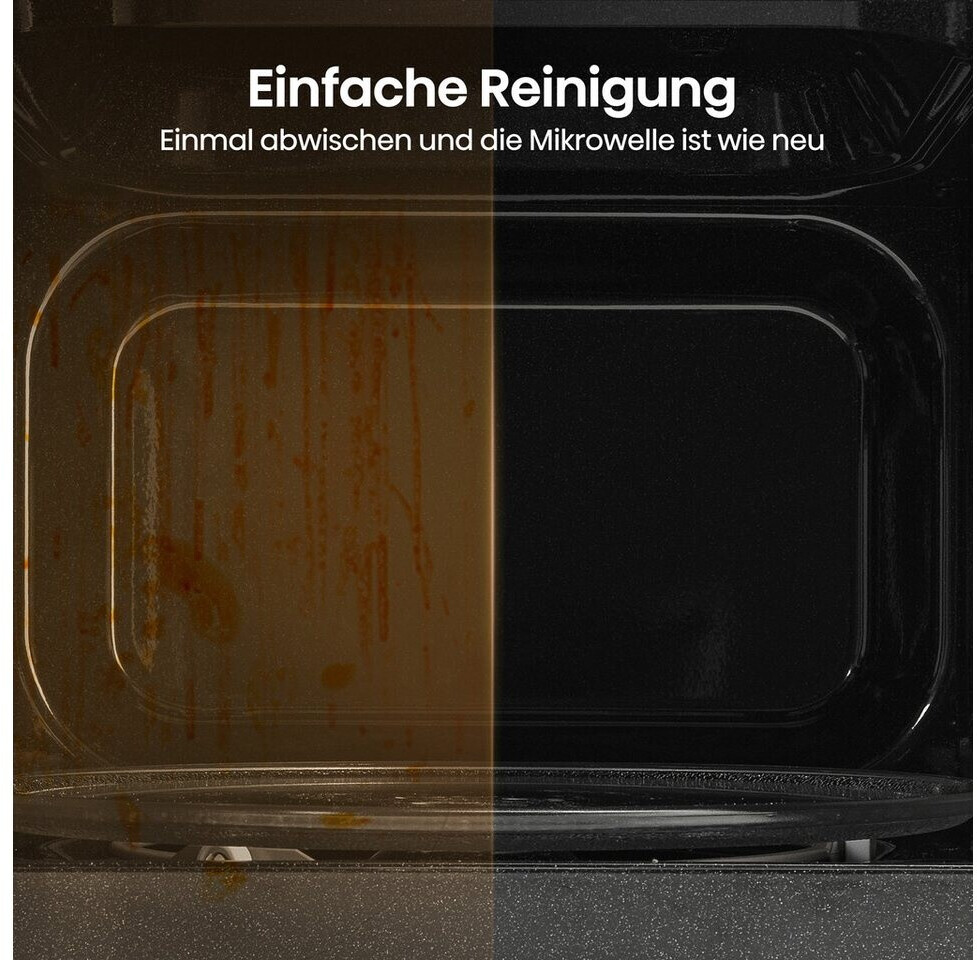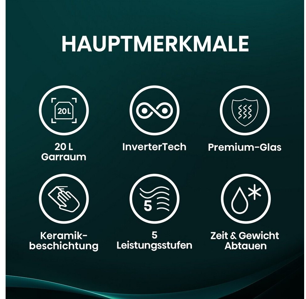 Das Design ist minimalistisch gehalten: Eine durchgehende Glasfront in Schwarz sorgt für eine edle Optik, die Steuerung erfolgt über klassische Drehregler, was die Bedienung extrem intuitiv macht. Mit 20 Litern Volumen ist sie kompakt genug für kleinere Küchen, bietet aber ausreichend Platz für gängige Speiseteller.