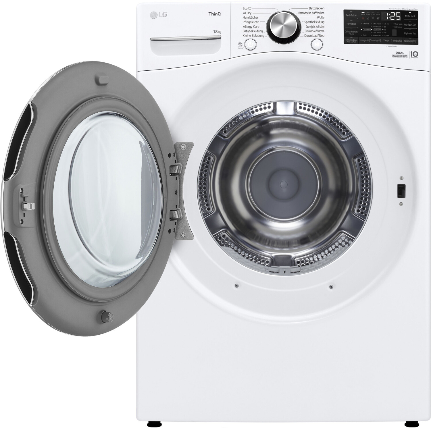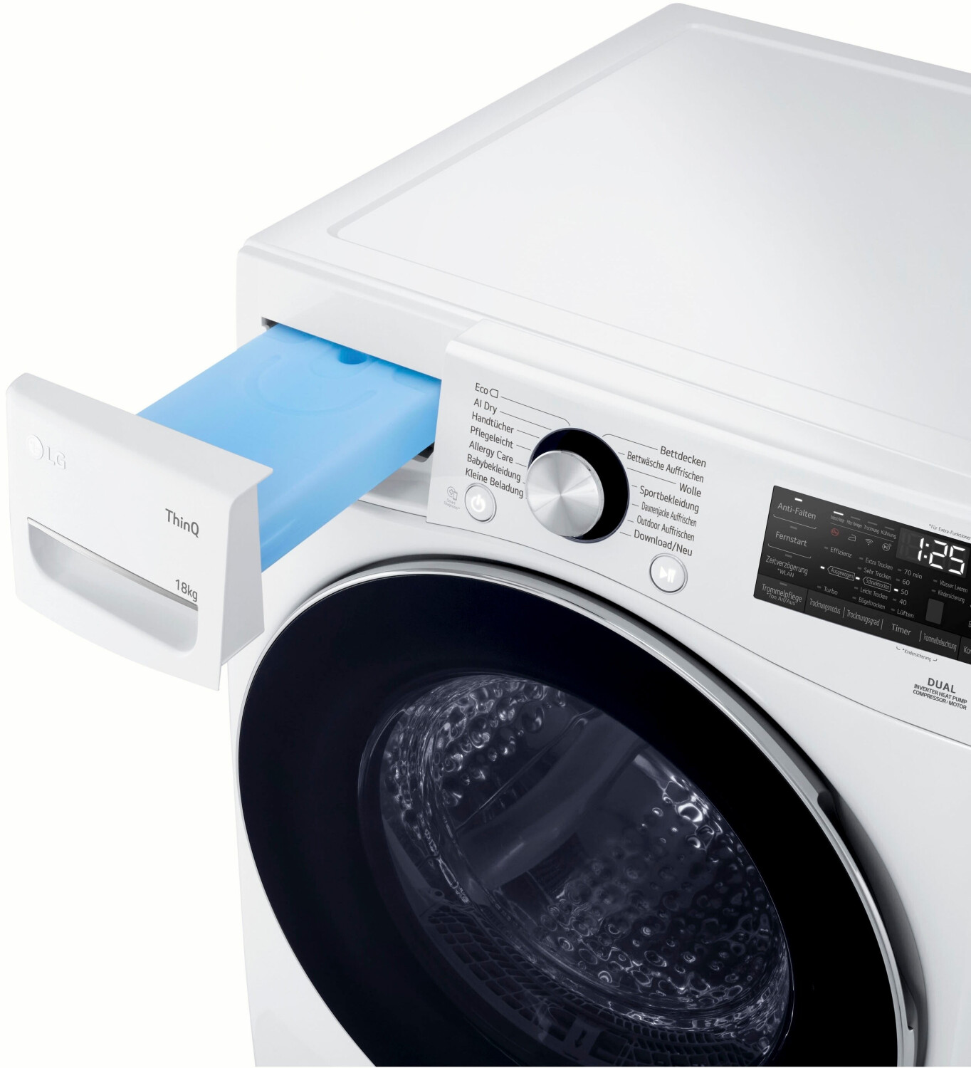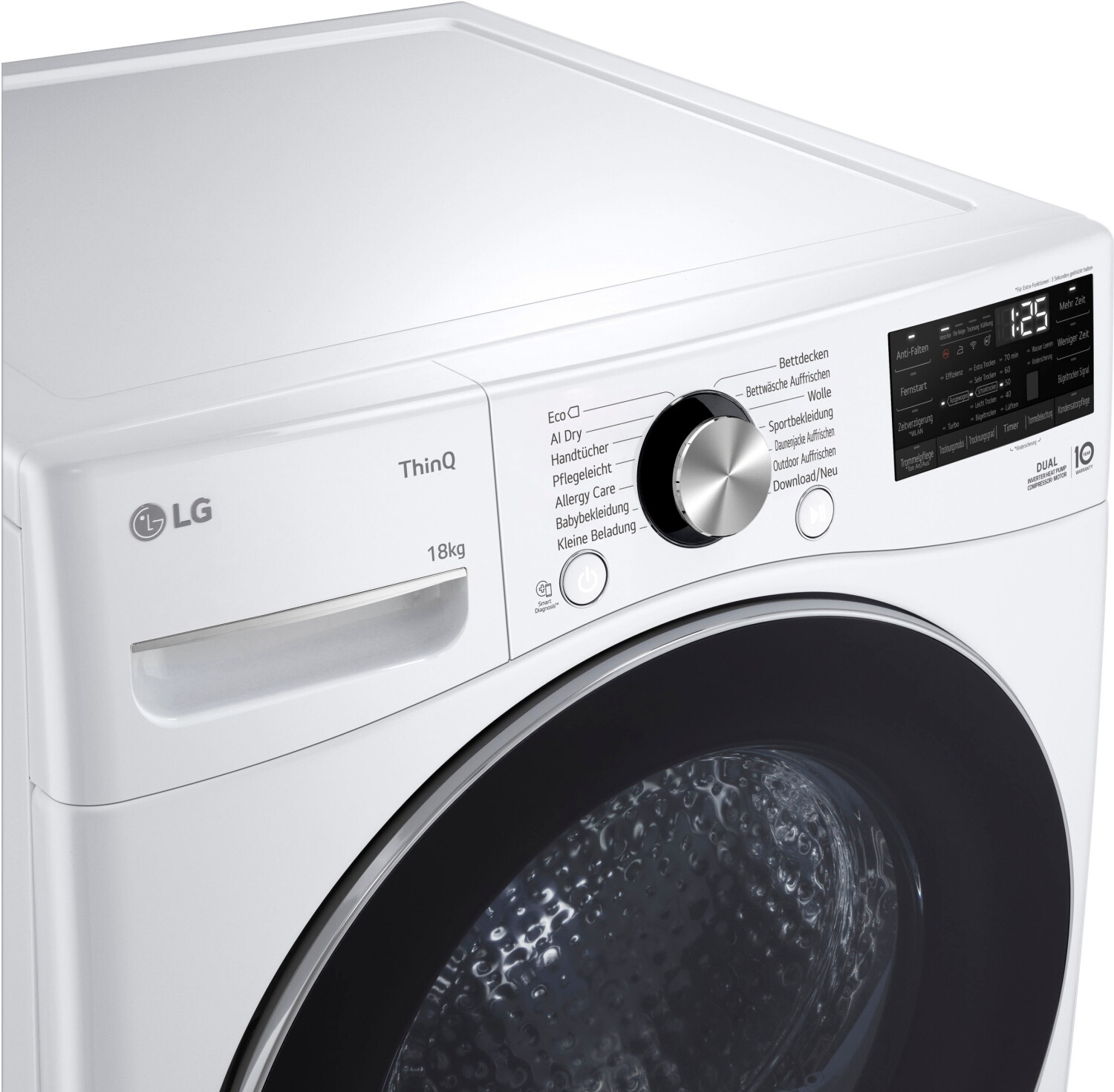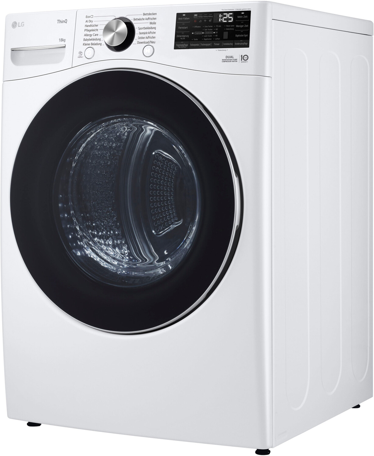 Der LG RT18VT ist einer der größten Trockner für den Heimgebrauch am Markt. Mit 18 kg Kapazität trocknet er mühelos das, was in drei normale Trockner passt. Dank der Dual Inverter Wärmepumpentechnologie geschieht dies bei niedrigen Temperaturen, was Ihre Kleidung schont und das Einlaufen minimiert. Das System AI Dry erkennt dabei automatisch die Textur der Stoffe und passt die Trocknungszeit und Temperatur präzise an, um Energie zu sparen.