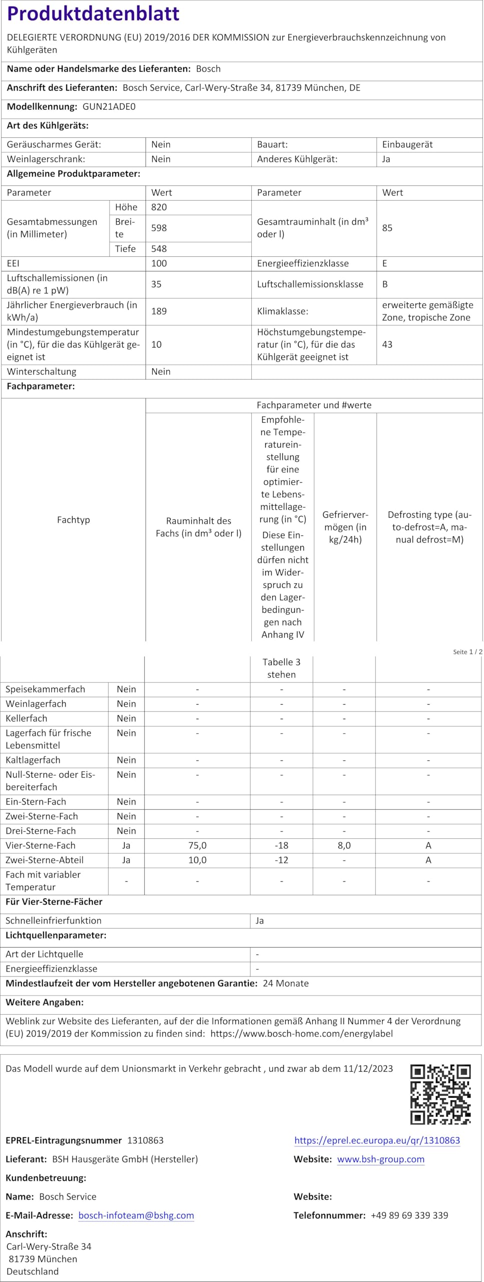 ProdukttypEinbaugefrierschrankBauartintegrierbarFarbeweißGefrierklasse4 SterneSerieBosch Serie 6Leistung & VerbrauchEnergieeffizienzklasseEStromverbrauch235 kWh/JahrGeräuschpegel (dB)35 dB(A)LuftschallemissionsklasseBKlimaklassenSN, N, ST, TGeräuschpegelsehr leiseGefrierteilInhalt Gefrierbereich212 LiterGefriervermögen in 24 h22 kgLagerzeit bei Störung14 hAnzahl Gefriergutschublade5Komfort & SicherheitSicherheitseinrichtungenmit Türalarm, mit selbstschließender TürKühlsystemNo-FrostInnenraum-Ausstattungmit Eiswürfelschale, mit Kälteakku, mit SchubladenEinfrierfunktionenmit Eingefrierautomatik, mit SchnellgefrierenTemperaturregelungelektronischWarnsignaloptischTüranschlägewechselbar, linksTürtechnikFesttürHersteller-BesonderheitenSuperFrost, BigBox, SoftClose, freshSense, TouchControl, varioZone, SupergefrierenTechnische DatenBreite55,8 cmHöhe177,2 cmTiefe54,5 cm