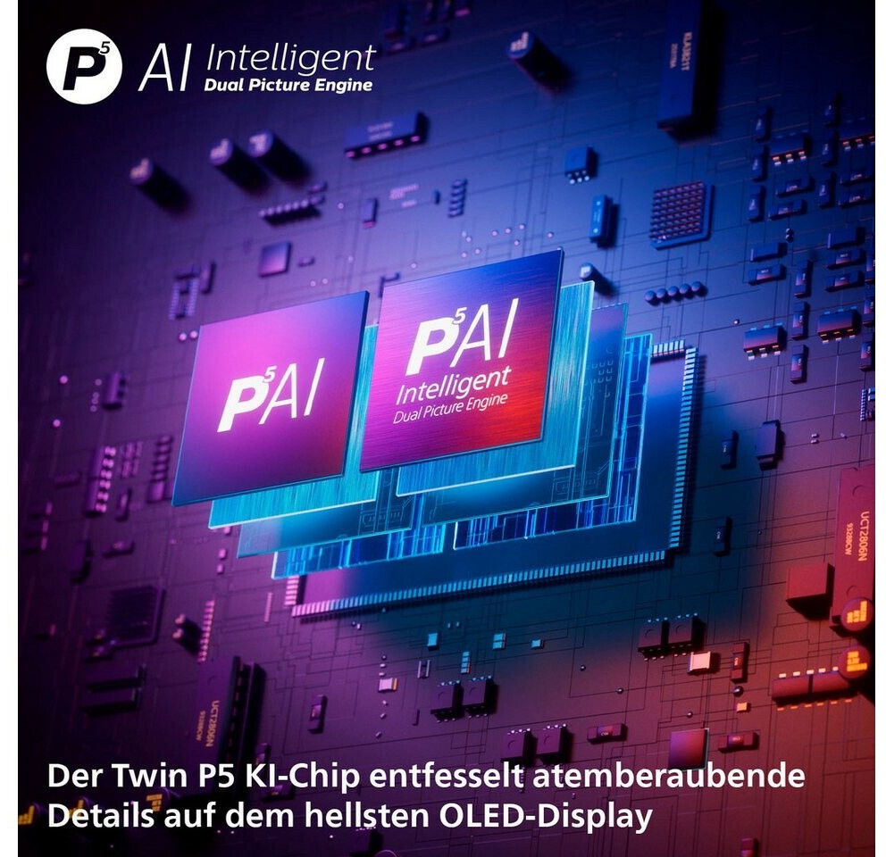 Der Philips 65OLED950 markiert die ästhetische Spitze des Philips OLED-Lineups 2025/26. Das Besondere: Hier kommt die leistungsstarke P5 AI Dual Engine zum Einsatz, die noch mehr Rechenleistung für KI-Upscaling und Bewegungsglättung bietet als die Standard-P5-Chips. In Kombination mit dem RGB Tandem-OLED Panel erreicht dieser Fernseher eine Brillanz und Helligkeit, die neue Rekorde setzt. Das extrem flache Gehäuse ermöglicht es, den Fernseher so nah an die Wand zu bringen, dass das 4-seitige Ambilight den Raum in eine nahezu lückenlose Lichtaura taucht.
