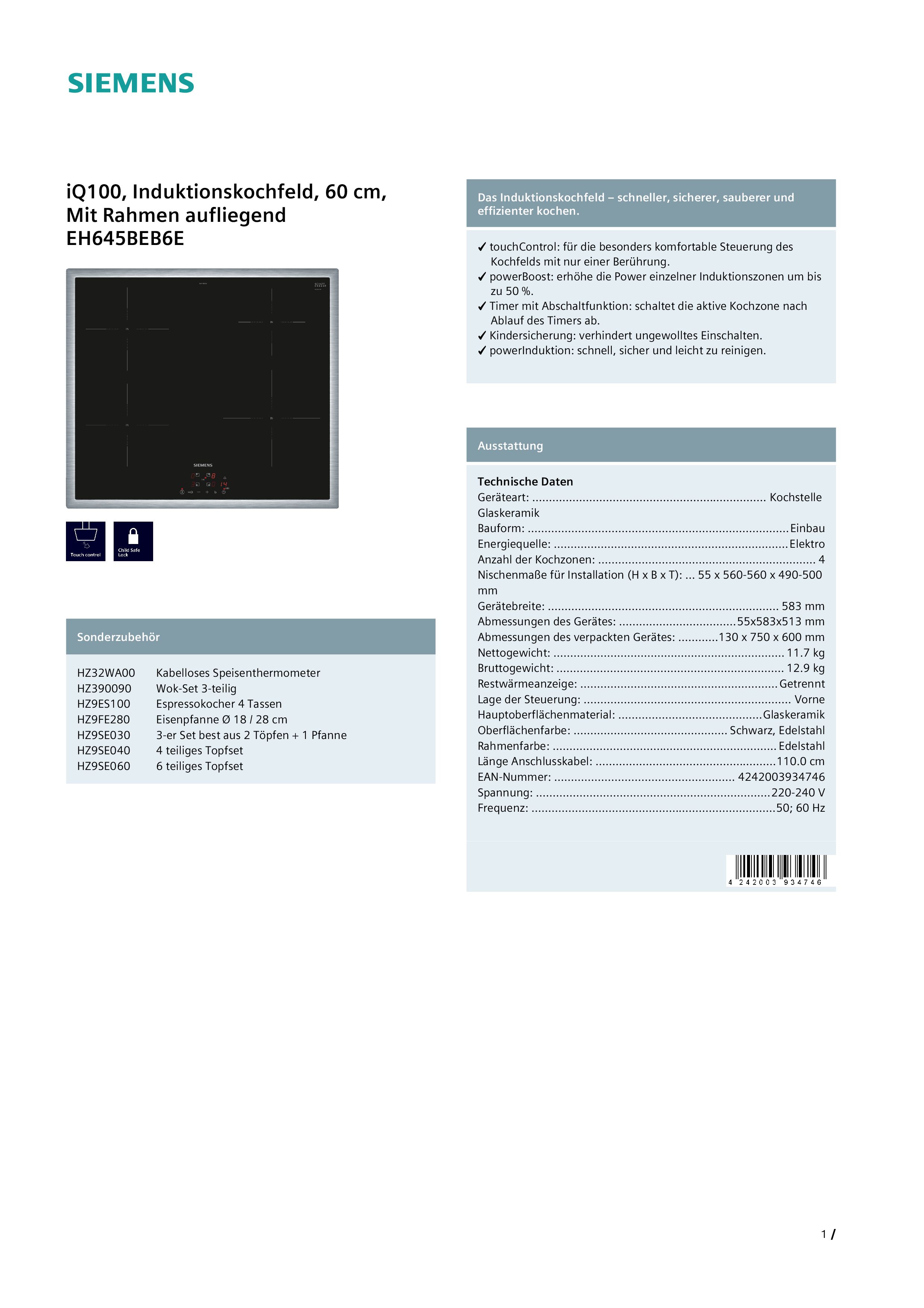 Funktionen | schnelles Aufheizen, Timer/Uhr, Pause & ReStart, Topferkennung, Energieverteilungs-Manager |