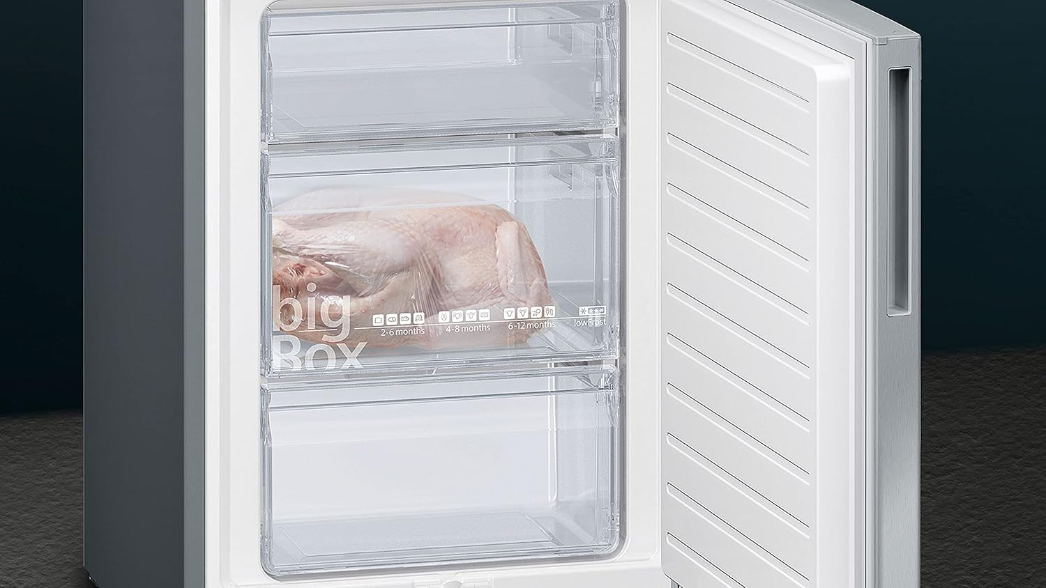 | Innenraum-Ausstattung | 0-Grad-Zone, Tauwasserablauf, Temperaturanzeige, Abstellflächen, Flaschenablage, Eierablage, Gefrierfach, Big Box |