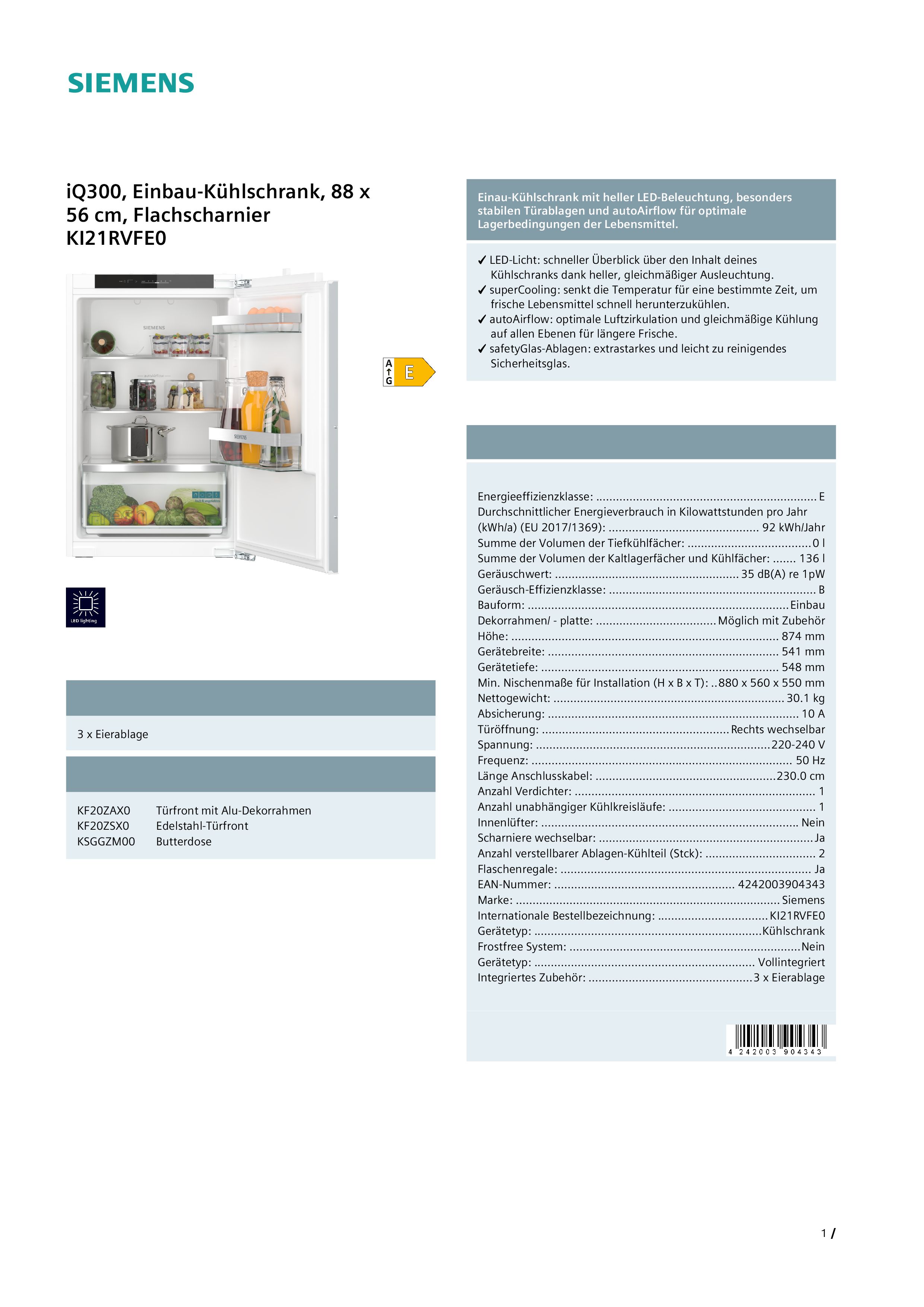 Einbaukühlschrank, Vollraumkühlschrank |