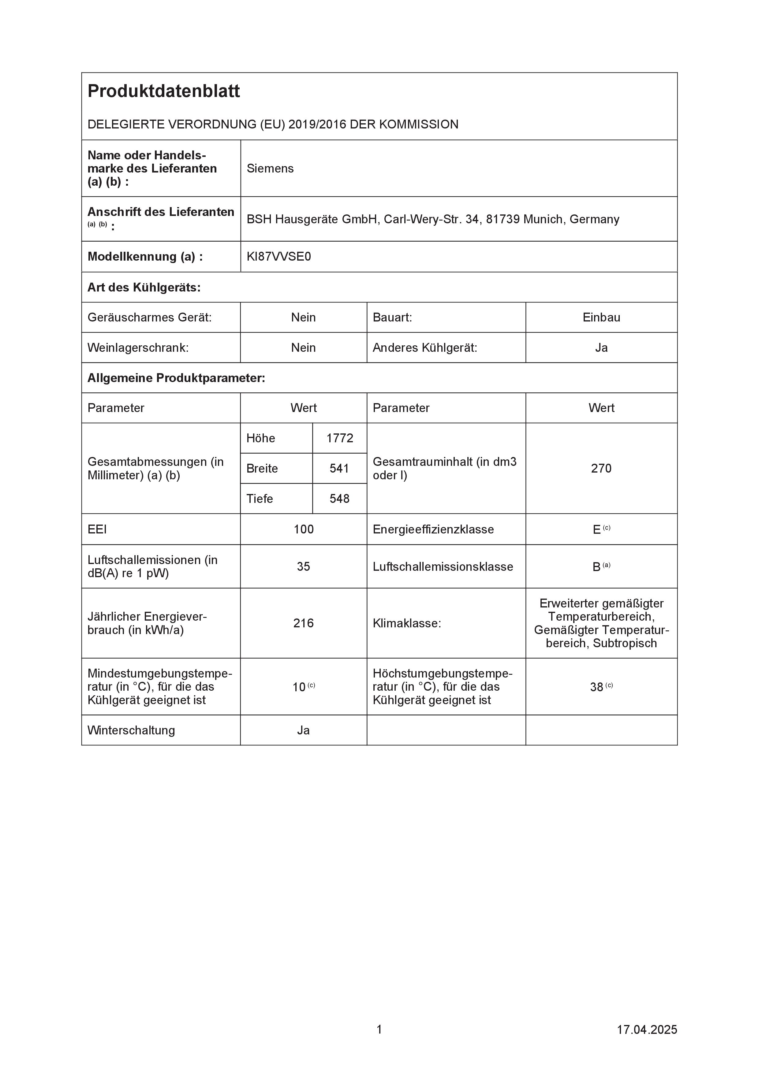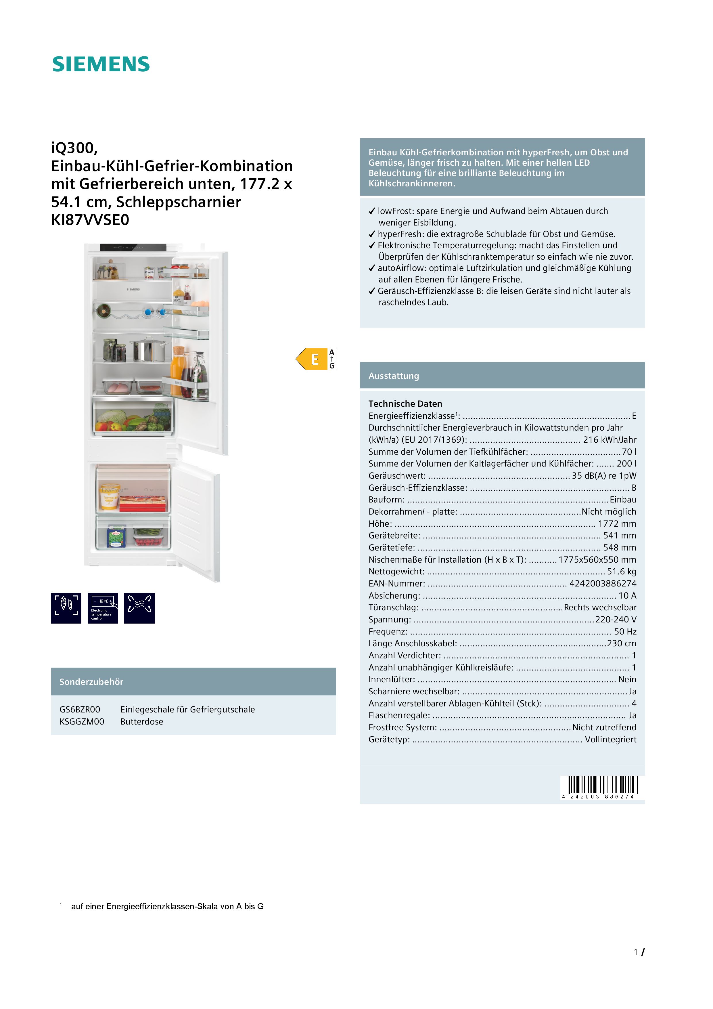 Eigenschaften "Siemens KI87VVSE0 iQ300 Einbau Kühl-Gefrier-Kombination"