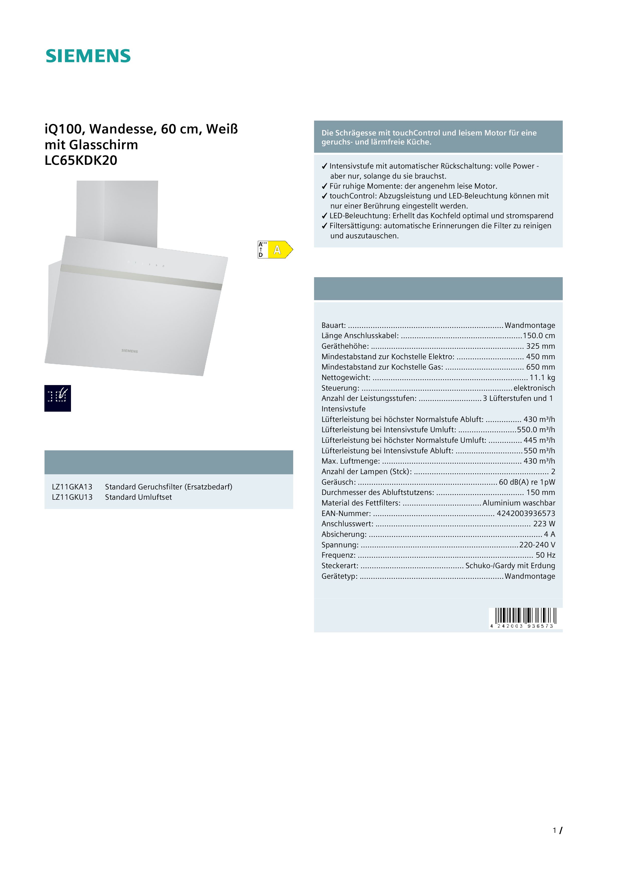 Eigenschaften "Siemens LC65KDK20 Wandhaube mit Touch-Control "
