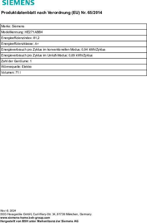 Eigenschaften "Siemens PQ212IAAB (HE271ABB4 + EI631CFB1E) Einbauherdset (Induktionskochfeld, A+, 71 l)"