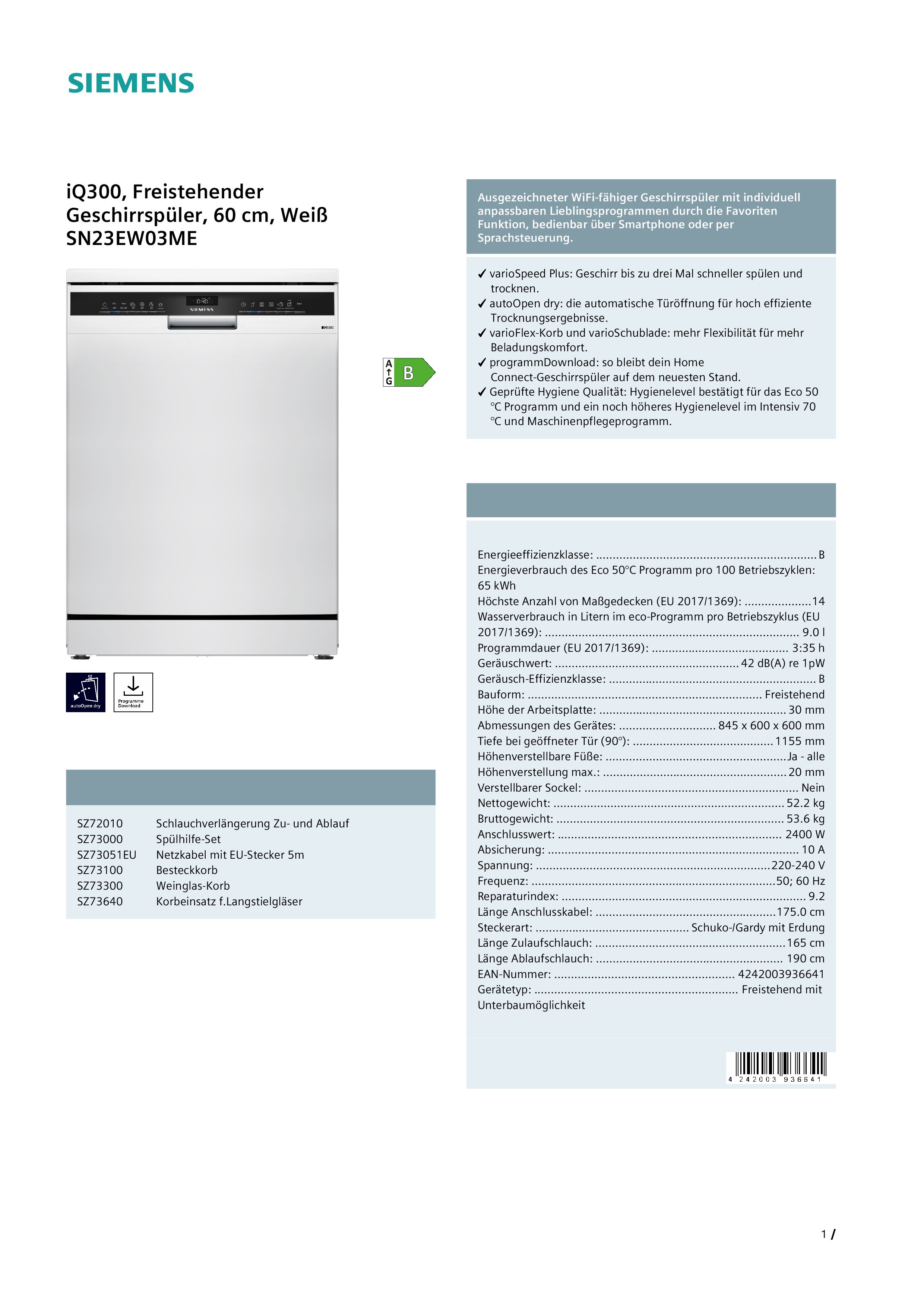 Eigenschaften "Siemens SN23EW03ME Standgeschirrspüler unterbaufähig Anzahl Maßgedecke 14 "