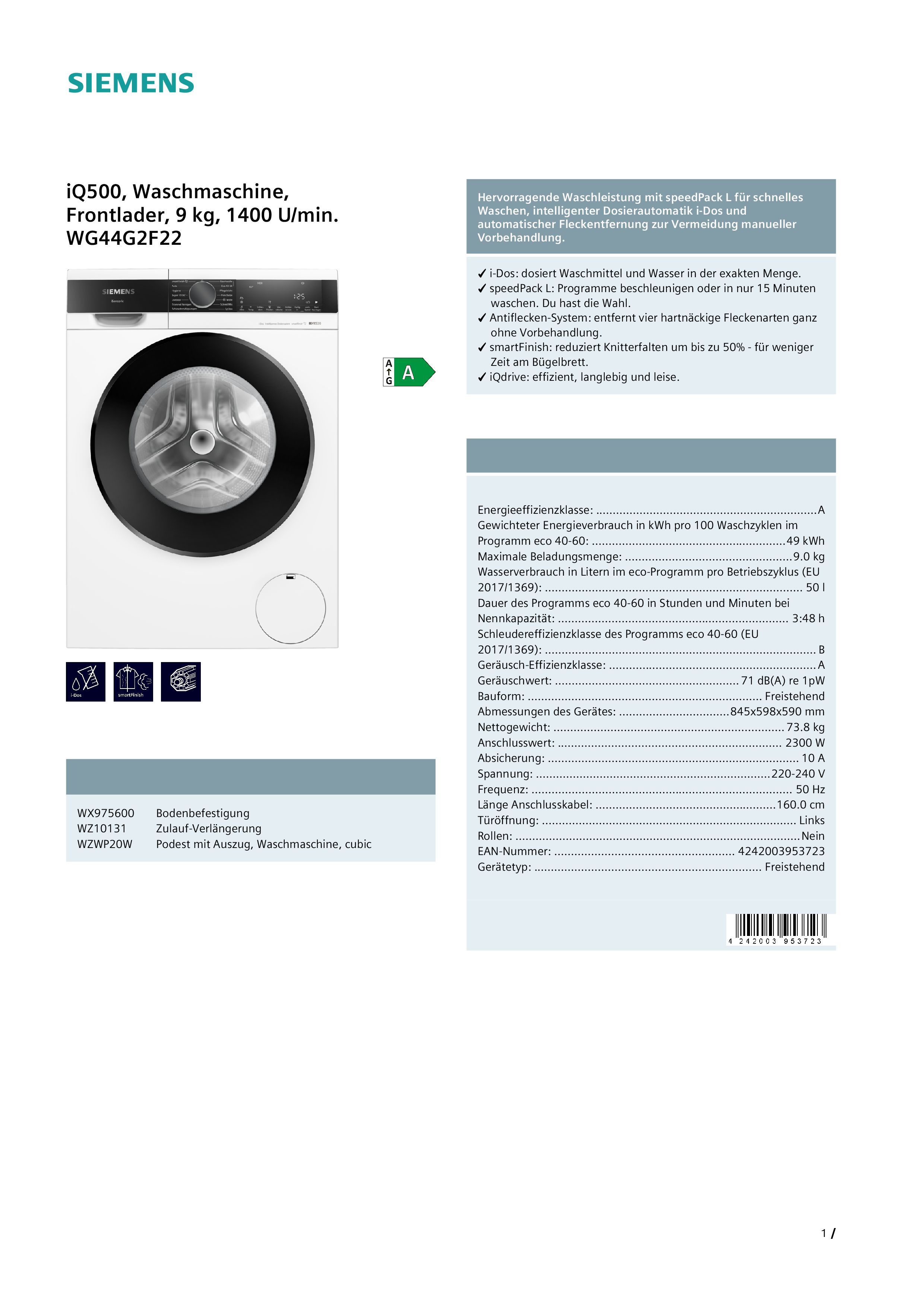 Eigenschaften "Siemens WG44G2F22 Waschmaschine, 9 kg, 1400 U/min, intelligente Dosierung"