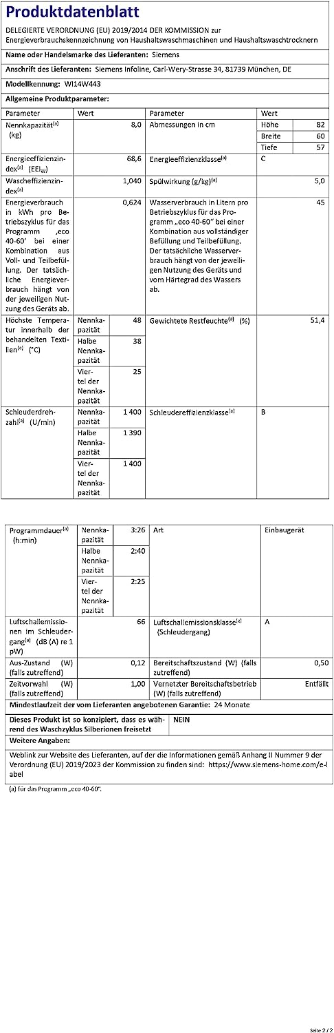 Eigenschaften "Siemens WI14W443 Waschmaschine Frontlader 8 kg 1.400 U/Min Startzeitvorwahl"