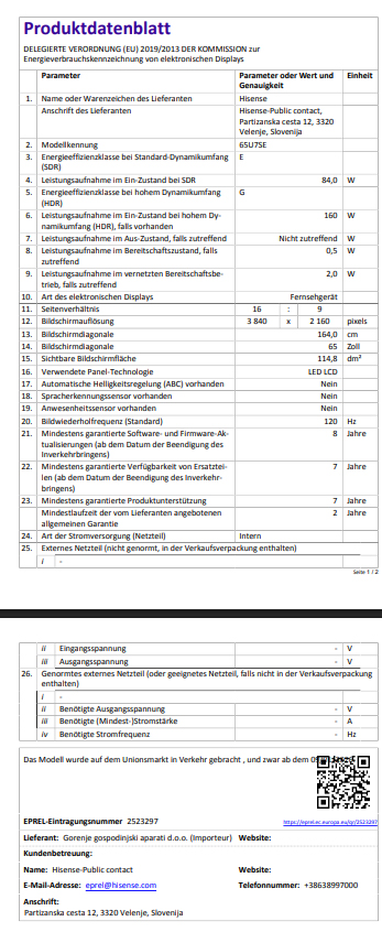 Hisense 65E7S 65 Zoll QLED 4K UHD Smart TV – Dolby Vision, Dolby Atmos, VIDAA OS, 60 Hz, WLAN – EAN 6942351431710